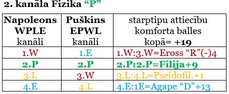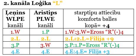 Lasītāj! Paraugā sniedzu divu psihosofisko tipu kanālu kopskatu un mijiedarbību. Rūpīgi iedziļinoties, Tu sapratīsi, kā veidojas starptipu attiecību kopējās balles. Skaties tabulu! Kā arī sapratīsi, kāpēc veidojas tik liela starpība ballēs. Tas vēlāk būs redzams katram tipam izveidotās saderības tabulās, kuras ievietosim, tiklīdz tiks pabeigti ievietot visus starptipu attiecību apraksti. Krāsas tiek pielāgotas tām krāsām, kādas redzamas psihosofisko tipu tabulā. Tas palīdzēs tev vieglāk izprast un iedziļināties (tā domā autore).