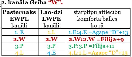 Lasītāj! Paraugā sniedzu divu psihosofisko tipu kanālu kopskatu un mijiedarbību. Rūpīgi iedziļinoties, Tu sapratīsi, kā veidojas starptipu attiecību kopējās balles. Skaties tabulu! Kā arī sapratīsi, kāpēc veidojas tik liela starpība ballēs. Tas vēlāk būs redzams katram tipam izveidotās saderības tabulās, kuras ievietosim, tiklīdz tiks pabeigti ievietot visus starptipu attiecību apraksti. Krāsas tiek pielāgotas tām krāsām, kādas redzamas psihosofisko tipu tabulā. Tas palīdzēs tev vieglāk izprast un iedziļināties (tā domā autore).